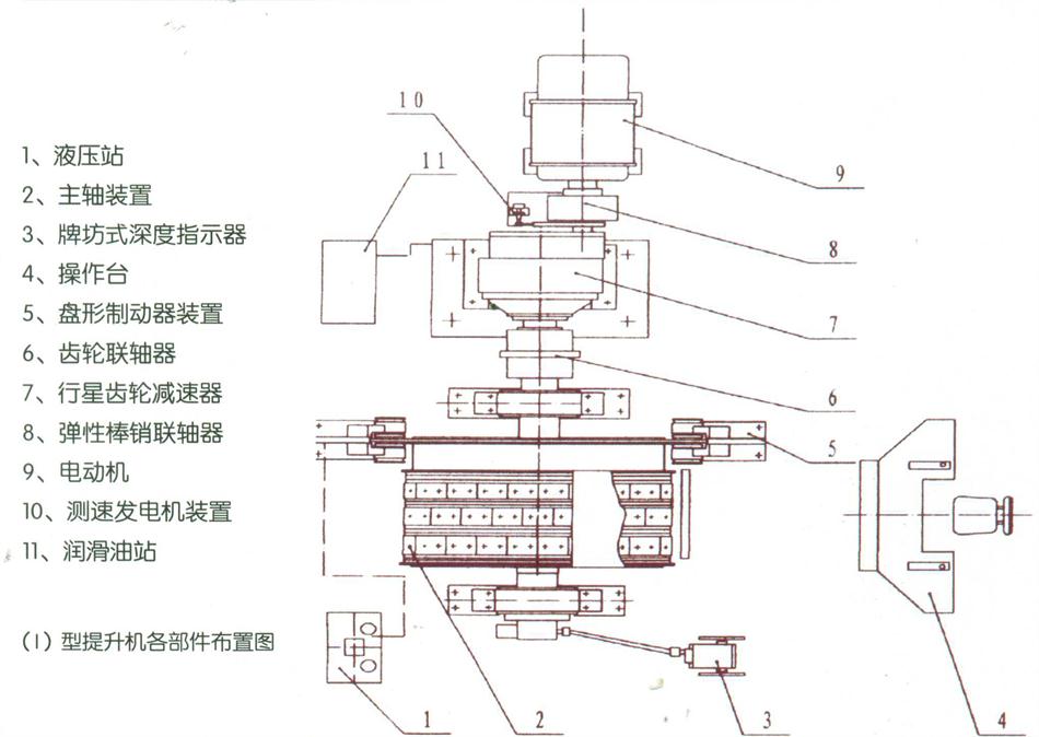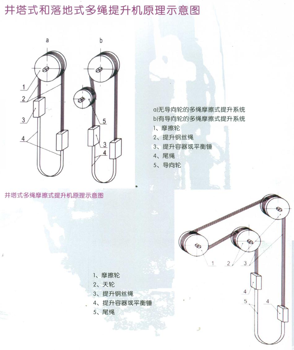 中間掛有容器的封閉鋼絲繩纏繞在卷筒上,當電機帶動卷筒轉動時,通過鋼絲繩與卷筒的摩擦力實現容器的提升與下放;通過電氣傳動實現調速;盤形制動器通過液壓與電氣控制實現制動;通過各種位置指示系統(tǒng)實現容器的深度指示;通過各種傳感器與控制元件組成的機、電、液聯合系統(tǒng),進行整機的監(jiān)控與保護;通過計算機和網絡技術實現提升機內、外的信息傳輸。